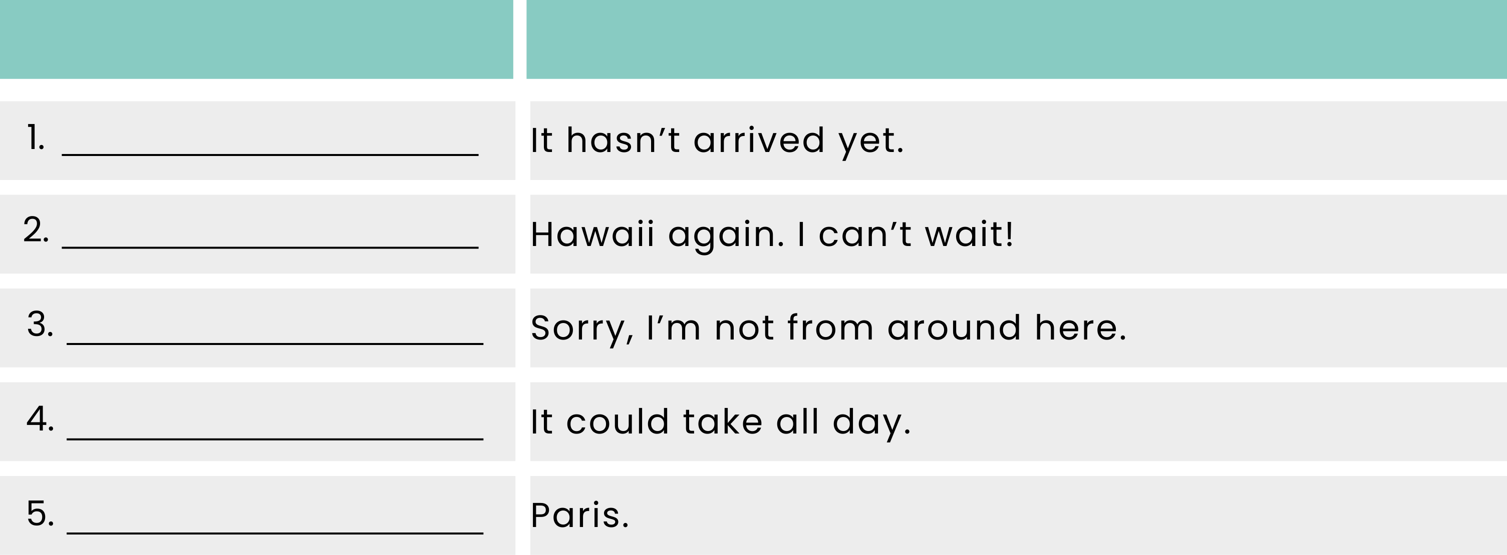 Instructions: Match each question with the two best possible responses. You can see commonly used expressions in each category in bold letters.